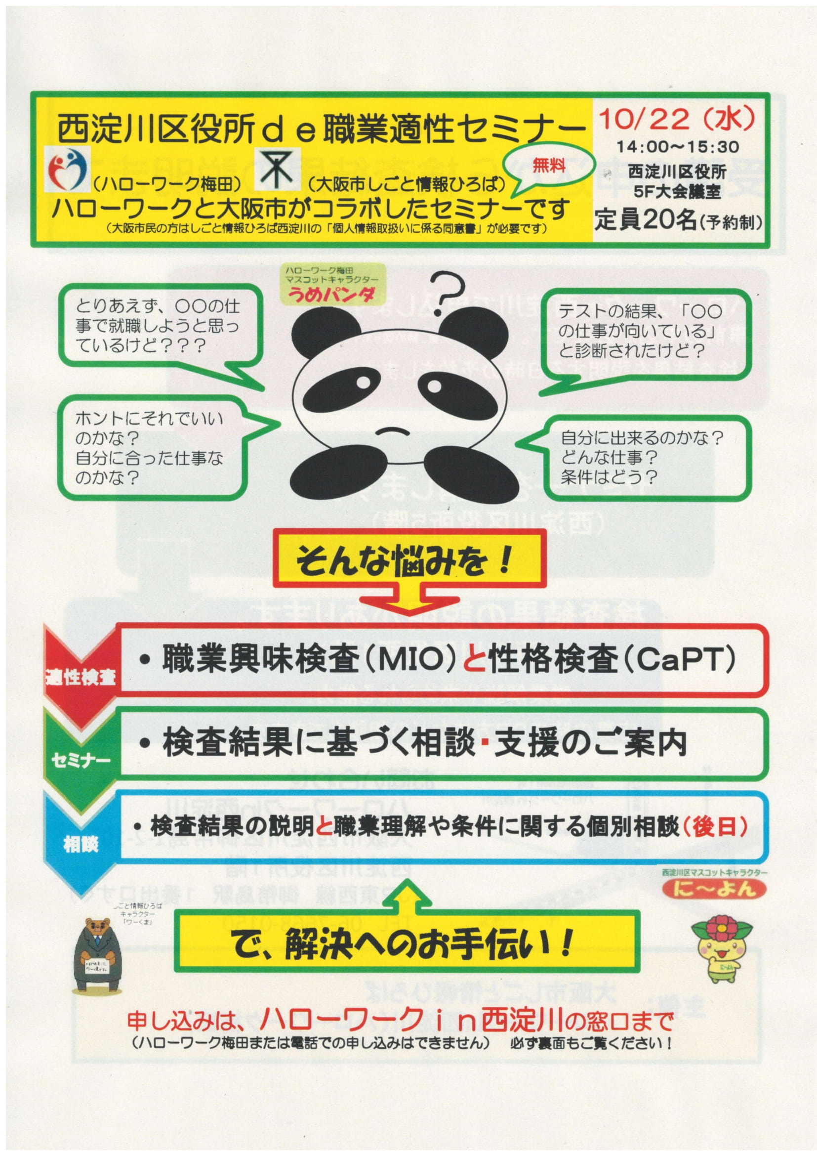 令和6年度 第4回目のハローワーク・ひろば合同適性セミナーを 10月23日(水)14:00~15:30に西淀川区役所3F会議室にて開催します。 ハローワークとしごと情報ひろばがコラボしたセミナーで、職業適性の診断テストの…